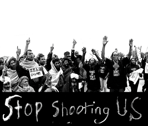 Animation over documentation photos of street art posters and murals combining images of protesters in Afghanistan and USA against drone warfare and police violence. The military vehicles sold to local police departments are part of the domestic militarization of police with retired equipment from the Forever War in Afghanistan publicly illustrating the --"insidious entwinements of war and police, metropole and colony"